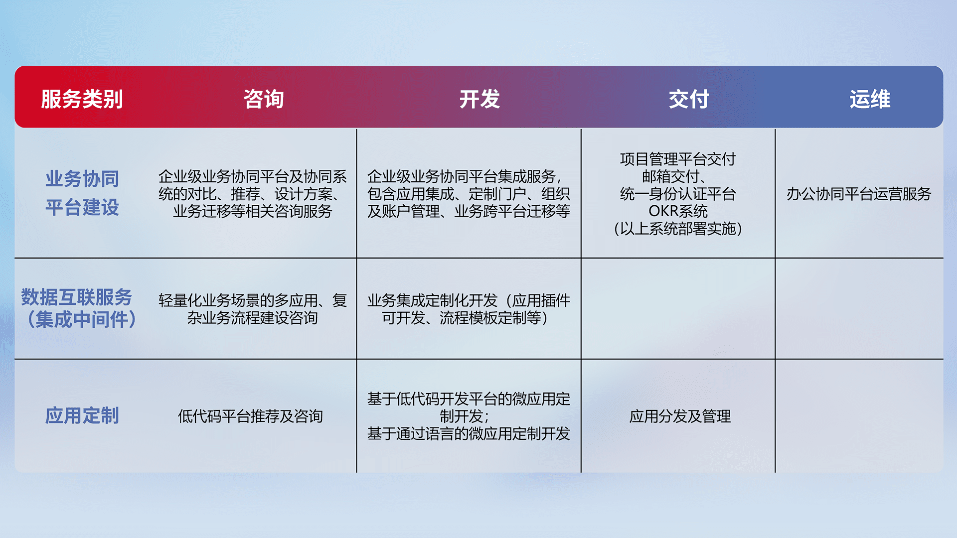 针对钉钉、、、、企微、、IDaas等平台级产品提供产品的规划、、、方案、、、交付、、、定制化开发等服务,,实现如统一协同办公、、智能客户服务、、混合会议管理、、智能数据查询、、、、等业务场景,,实现数字化转型。。
